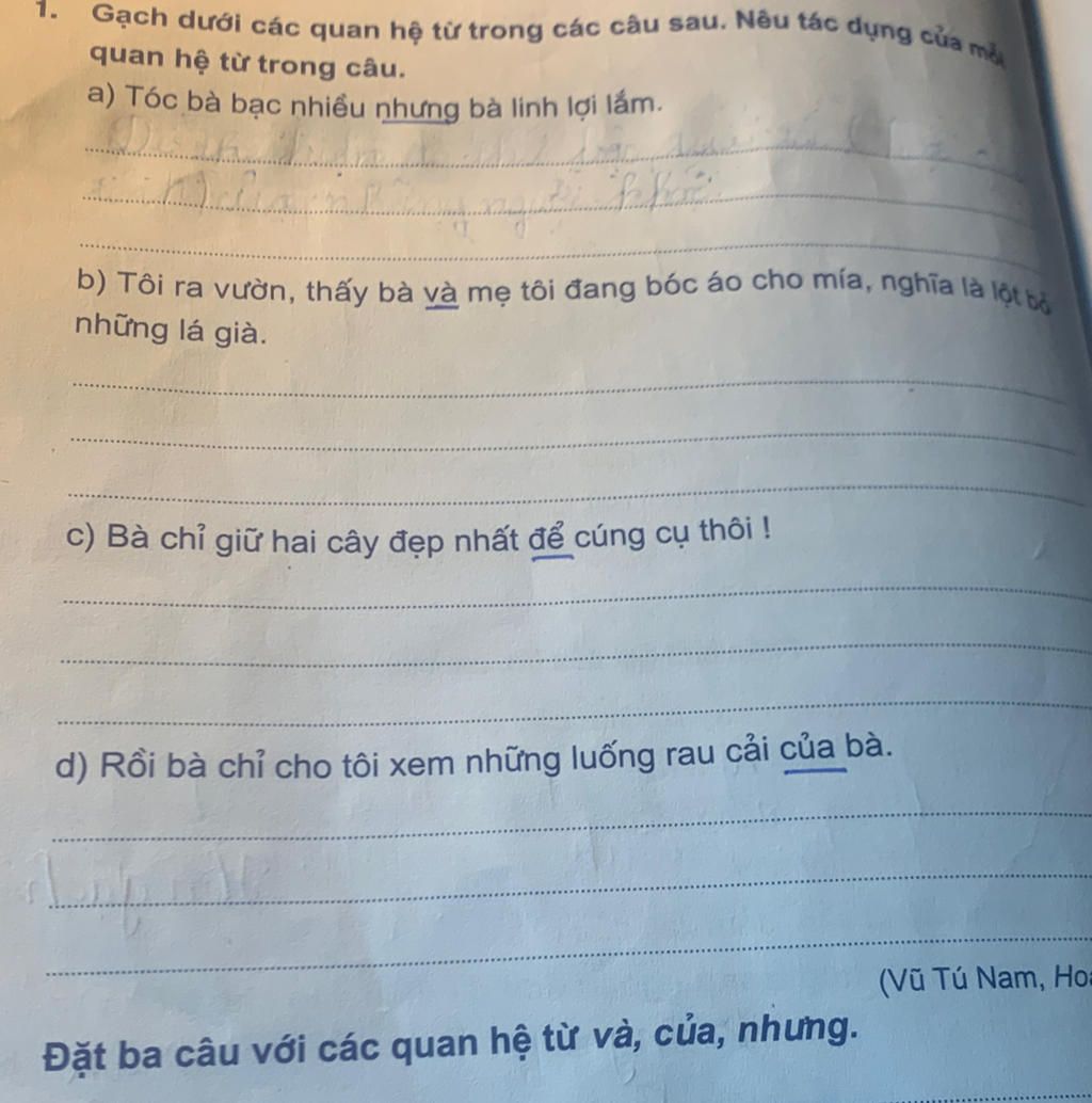 Đặt ba câu với các quan hệ từ và, của, nhưng.