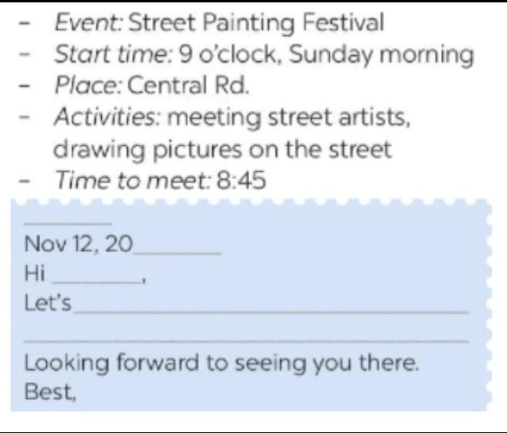 Let’s take part in the Street Painting Festival at 8 a.m on Sunday morning this week. The festival will be taken place on Central Road. At the festival, you have a chance to meet street artists and draw pictures on the street. I sure it will be an interesting and great activity. What about meeting at 7.45 a.m? Let me know if you can come.