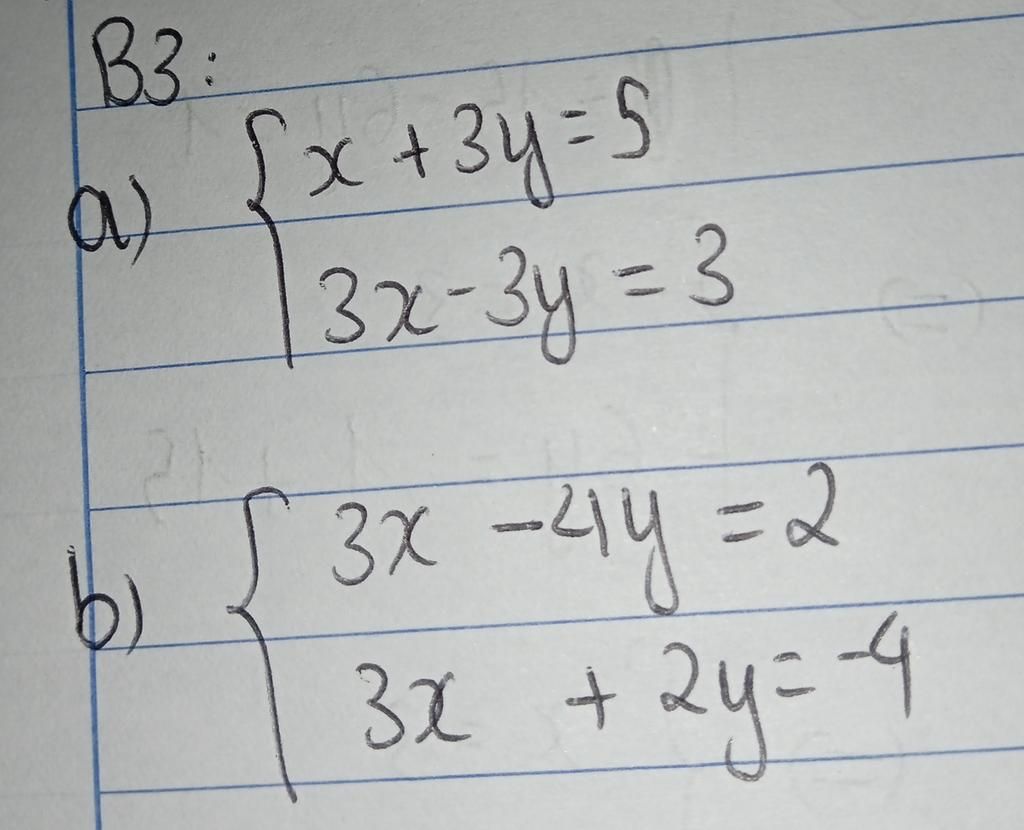 `a)``{(x+3y=5),(3x-3y=3):}`