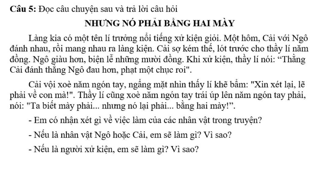 -Nếu là người xử kiện em sẽ không nhận hối lộ,xử cả 2 người có tội vì cả 2 đều đánh nhau rồi trung gian hòa giải cho cả 2 bên