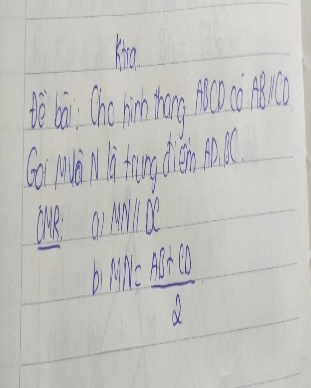 `=> MN = (AB+CD)/2` (Đường trung bình của hình thang thì song song với hai đáy và bằng nửa tổng hai đáy)