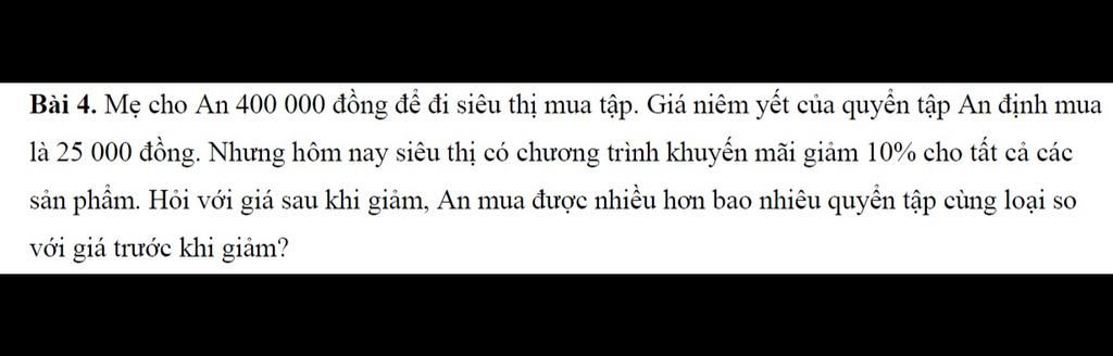 Bài 4. Mẹ cho An 400 000 đồng để đi siêu thị mua tập. Giá niêm yết của quyển tập An định mua