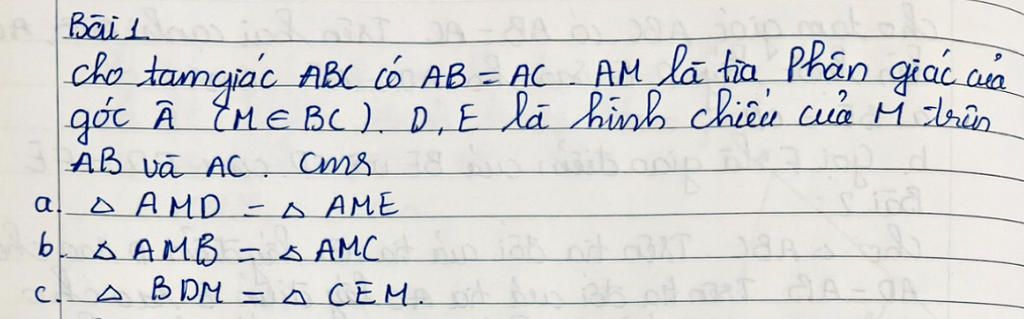 $\widehat{MAD}=\widehat{MAE}$ vì $AM$ là phân giác $\widehat{BAC}$