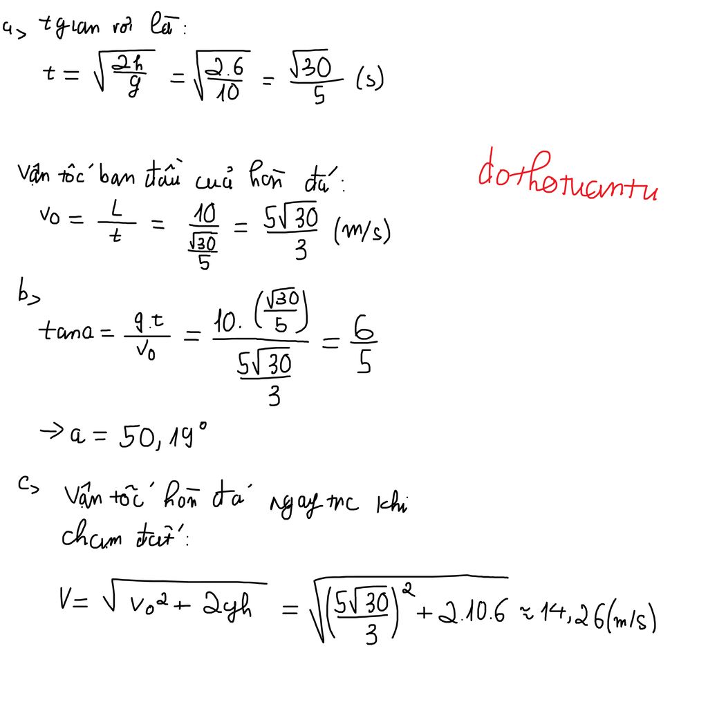 \(v = \sqrt {v_0^2 + {{\left( {gt} \right)}^2}} = \sqrt {{{\left( {\dfrac{{5\sqrt {30} }}{3}} \right)}^2} + {{\left( {10.\dfrac{{\sqrt {30} }}{5}} \right)}^2}} = 14,26\left( {m/s} \right)\)