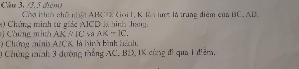 Ta có AICK là hình bình hành => AC và IK là đường chéo => AC và KI cắt nhau tại O (AO=OC, IO=OK) (t/c) (2)