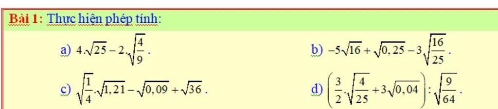 `a)` `4\sqrt{25}-2\sqrt{4/9}`$\\$ `=4\sqrt{5^2}-2\sqrt{(2/3)^2}`$\\$ `=4.5-2.(2)/3`$\\$ `=20-4/3=56/3`$\\$ `b)` `-5\sqrt{16}+\sqrt{0,25}-3\sqrt{16/25}`$\\$ `=-5\sqrt{16}+\sqrt{1/4}-3\sqrt{16/25}`$\\$ `=-5\sqrt{4^2}+\sqrt{(1/2)^2}-3\sqrt{(4/5)^2}`$\\$ `=-5.4+1/2-3.(4)/5`$\\$ `=-20+1/2-12/5=-219/10`$\\$ `c) ` `\sqrt{1/4}.\sqrt{1,21}-\sqrt{0,09}+\sqrt{36}`$\\$ `=\sqrt{(1/2)^2}.\sqrt{(1,1)^2}-\sqrt{(0,3)^2}+\sqrt{6^2}`$\\$ `=1/(2).1,1-0,3+6`$\\$ `=1/(2).11/10-3/10+6`$\\$ `=11/20-3/10+6=25/4`$\\$`d)` `(3/2.\sqrt{4/25}+3\sqrt{0,04}):\sqrt{9/64}`$\\$ `=(3/2.\sqrt{(2/5)^2}+3\sqrt{(0,2)^2}):\sqrt{(3/8)^2}`$\\$ `=(3/2.(2)/5+3.0,2):3/8`$\\$ `=(3/2.(2)/5+3.(1)/5):3/8`$\\$ `=(3/5+3/5):3/8`$\\$ `=6/(5):3/8`$\\$ `=6/(5).(8)/3`$\\$ `=48/15=16/5`$\\$