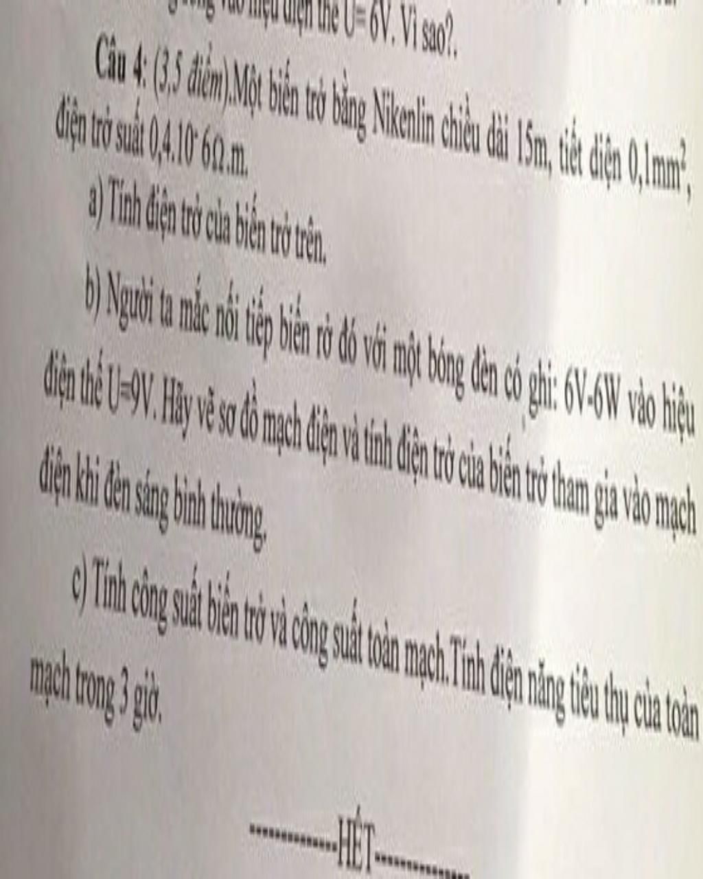 Câu 4 (3 điểm. Một biến trở bằng Nikanlin chiếu đi làm hết diện mạ