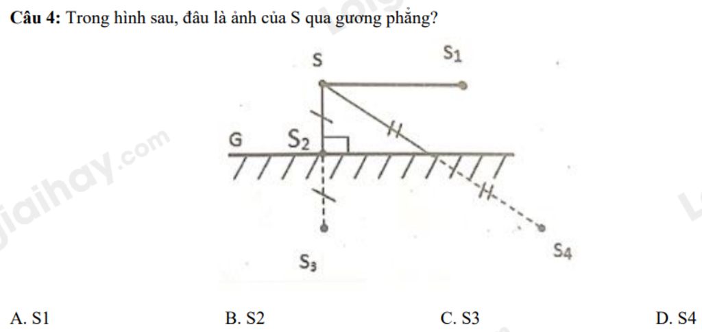 `4:` Trong hình sau, ảnh của `S` qua gương phẳng là`:`