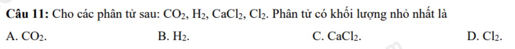 Câu 11: Cho các phân tử sau: CO2, H2, CaCl2, Cl2. Phân tử có khối lượng nhỏ nhất là
