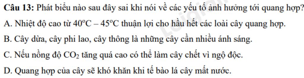 Câu 13: Phát biểu nào sau đây sai khi nói về các yếu tố ảnh hưởng tới quang hợp?