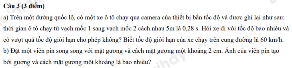 a) Trên một đường quốc lộ, có một xe ô tô chạy qua camera của thiết bị bắn tốc độ và được ghi lại như sau: thời gian ô tô chạy từ vạch mốc 1 sang vạch mốc 2 cách nhau 5m là 0,28 s. Hỏi xe đi với tốc độ bao nhiêu và có vượt quá tốc độ giới hạn cho phép không? Biết tốc độ giới hạn của xe chạy trên cung đường là 60 km/h.