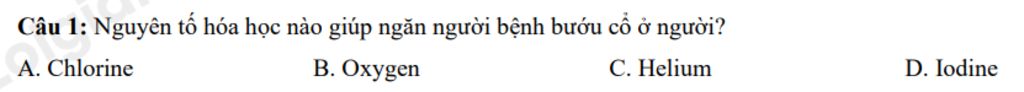 Câu `1:` Nguyên tố hóa học nào giúp ngăn người bệnh bướu cổ ở người?