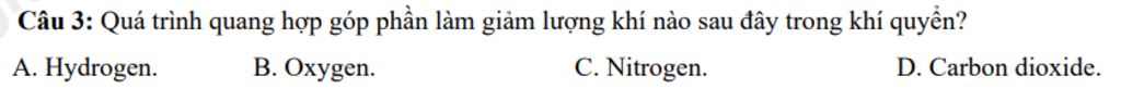 Câu 3: Quá trình quang hợp góp phần làm giảm lượng khí nào sau đây trong khí quyển?