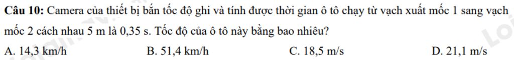 Câu `10:` $Camera$ của thiết bị bắn tốc độ ghi và tính được thời gian ô tô chạy từ vạch xuất mốc `1` sang vạch mốc `2` cách nhau `5 m` là `0,35 s`. Tốc độ của ô tô này bằng bao nhiêu?