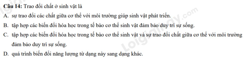 Trao đổi chất ở sinh vật là tập hợp các biến đổi hoá học trong tế bào cơ thể sinh vật và sự trao đổi chất giữa cơ thể với môi trường đảm bảo duy trì sự sống