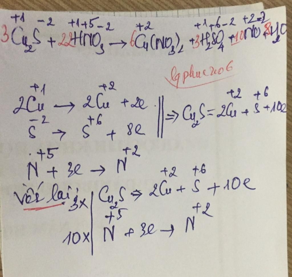 $3Cu_2S+16H^{+}+10NO_3^{-}\rightarrow 6Cu^{2+}+10NO+H_2SO_4+8H_2O$