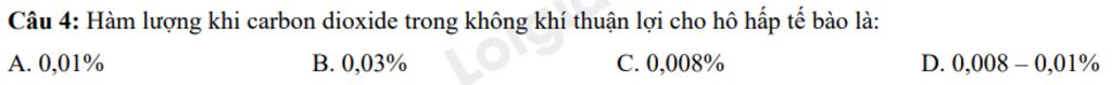 Câu `4:` Hàm lượng khi carbon dioxide trong không khí thuận lợi cho hô hấp tế bào là: