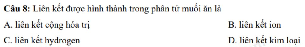 `->` Liên kết được hình thành trong phân tử muối ăn là `NaCl`