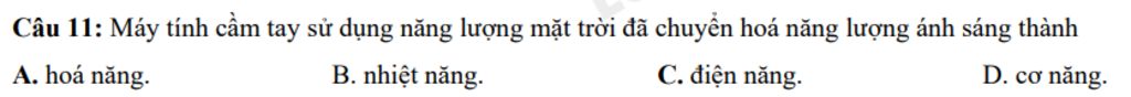 Câu `11:` Máy tính cầm tay sử dụng năng lượng mặt trời đã chuyển hoá năng lượng ánh sáng thành `:`