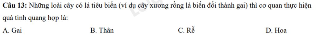 Câu 13: Những loài cây có lá tiêu biến (ví dụ cây xương rồng lá biến đổi thành gai) thì cơ quan thực hiện