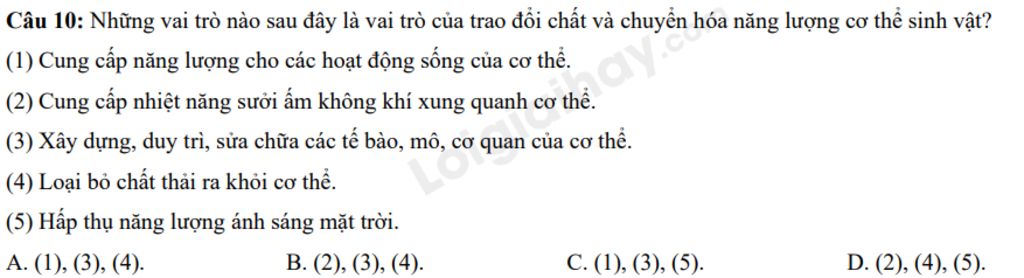 Câu `10:` Những vai trò nào sau đây là vai trò của trao đổi chất và chuyển hóa năng lượng cơ thể sinh vật?