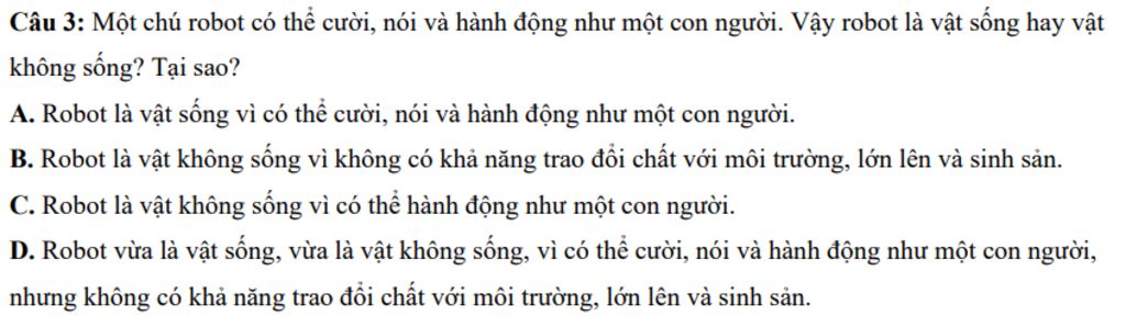 D. Robot vừa là vật sống, vừa là vật không sống, vì có thể cười, nói và hành động như một con người, nhưng không có khả năng trao đổi chất với môi trường, lớn lên và sinh sản.