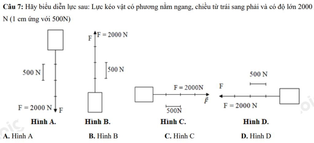 Ở hình C, có độ lớn là 2000N, chia đôi làm 4 tỉ xích bằng nhau, mỗi tỉ xích 1cm ứng với 2000N : 4 = 500N `=>` Chọn C