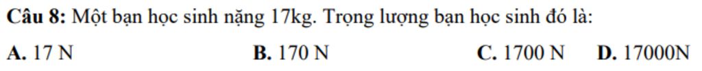 Vậy trọng lượng bạn học sinh đó là `170 NN`