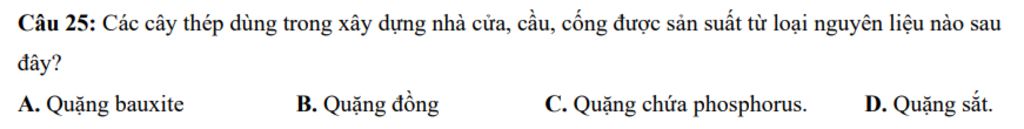 Các cây thép dùng trong xây dựng nhà cửa, cầu, cống được làm từ quặng sắt `=>` Chọn D