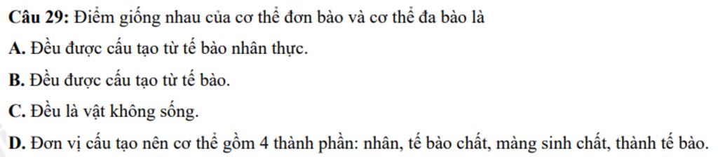 Câu 29: Điểm giống nhau của cơ thể đơn bào và cơ thể đa bào là