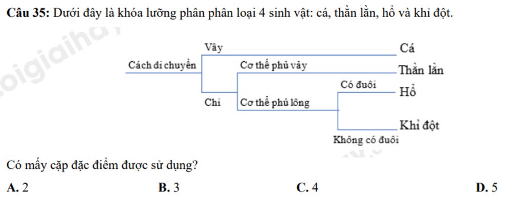 Câu 35: Dưới đây là khóa lưỡng phân phân loại 4 sinh vật: cá, thằn lằn, hổ và khỉ đột. Có mấy cặp đặc điểm được sử dụng?