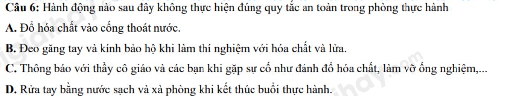 `=>` Chọn `A.` vì không được đổ hoá chất ra ngoài.