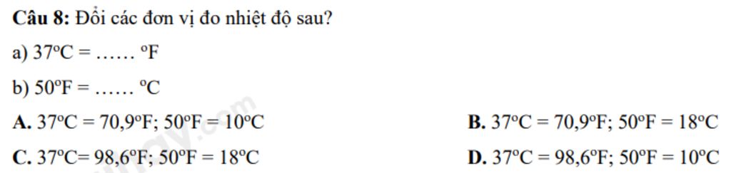 Đáp án đúng là : `D. 37^oC = 98,6^oF; 50^oF = 10^oC`