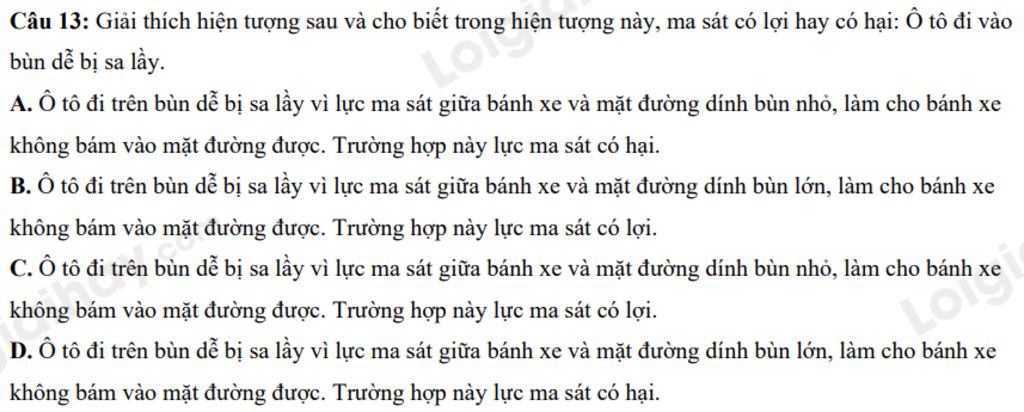 `=>` Ô tô đi trên bùn dễ bị sa lầy vì lực ma sát giữa bánh xe và mặt đường dính bùn lớn, làm cho bánh xe không bám vào mặt đường được là lực ma sát có hại vì có thể làm cho xe bị ngã và tổn thương cho người đi.