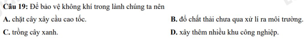 Câu `19:` Để bảo vệ không khí trong lành chúng ta nên :