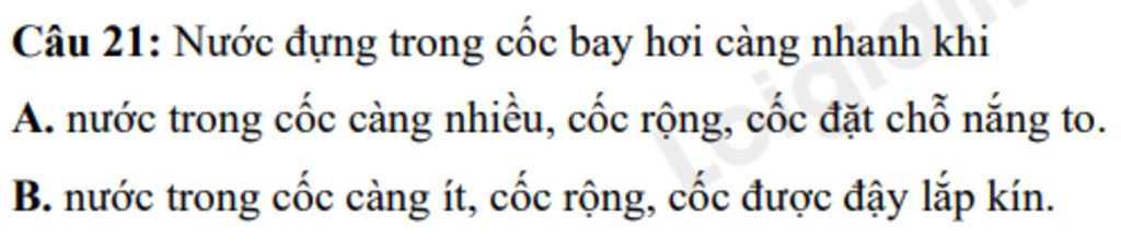 Câu `21:` Nước đựng trong cốc bay hơi càng nhanh khi :