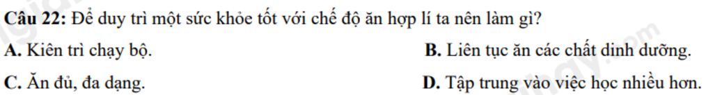 Câu `22:` Để duy trì một sức khỏe tốt với chế độ ăn hợp lí ta nên làm gì?