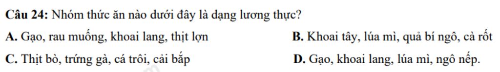 Câu `24: D`. Gạo, khoai lang, lúa mì, ngô nếp