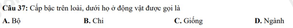 Câu `37:` Cấp bậc trên loài, dưới họ ở động vật được gọi là :