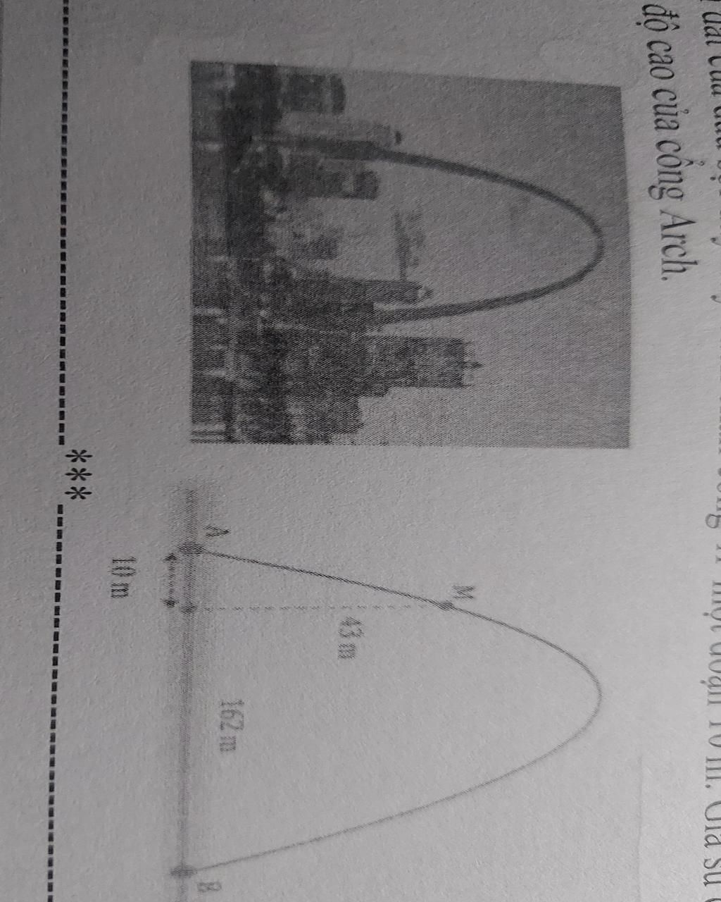Câu 2. Cổng Arch tại thành phố St.Louis của Mỹ có hình dạng là một parabol. Biết khoảng cách giữa hai chân công bằng 162m. Trên thành công, tại vị trí có độ cao 43 m so với mặt đất, người ta thả một sợi dây chạm đất. Vị trí chạm đất của đầu sợi dây này cách chân công A một đoạn 10 m. Giả sử các số liệu trên là chính xác. Hãy tỉnh độ cao của cổng Arch.