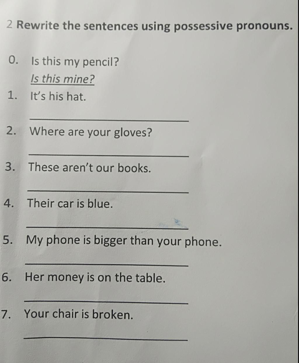 `7.` Yours is broken. (your chair (ghế của bạn) = yours)