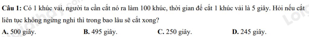 Câu `1:` Có `1` khúc vải, người ta cần cắt nó ra làm `100` khúc, thời gian để cắt `1` khúc vải là `5` giây. Hỏi nếu cắt liên tục không ngừng nghỉ thì trong bao lâu sẽ cắt xong?