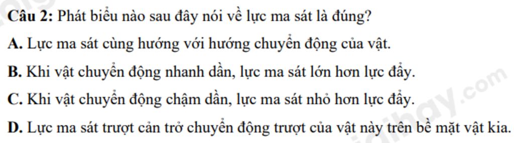 Câu `2:` Phát biểu nào sau đây nói về lực ma sát là đúng?