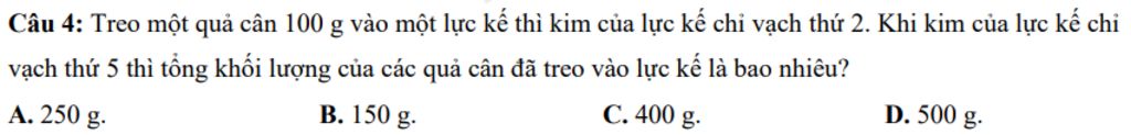 Câu `4:` Treo một quả cân `100g` vào một lực kế thì kim của lực kế chỉ vạch thứ `2`. Khi kim của lực kế chỉ vạch thứ `5` thì tổng khối lượng của các quả cân đã treo vào lực kế là bao nhiêu?