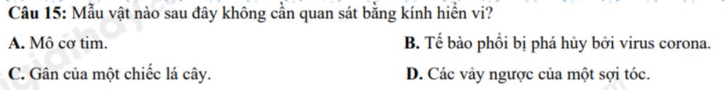 Câu 15 : Mẫu vật nào sau đây không cần quan sát bằng kính hiển vi ?