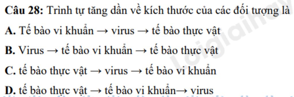 `-` Giải thích `:` Virus là tế bào nhỏ nhất `,` tiếp là là tế bào vi khuẩn` ,` rồi đến tế bào thực vật `.`