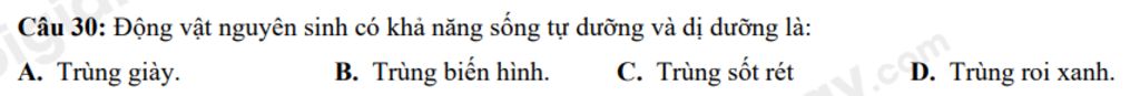 `-` Câu `30``:` Động vật nguyên sinh có khả năng sống tự dưỡng và dị dưỡng là`:`