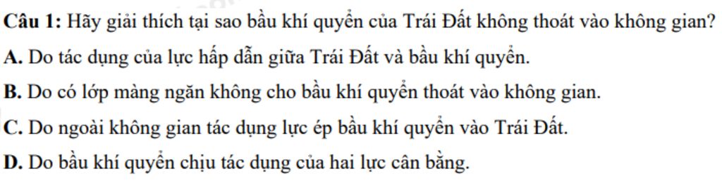 `-> text{A}.` Do tác dụng của lực hấp dẫn giữa Trái Đất và bầu khí quyển.