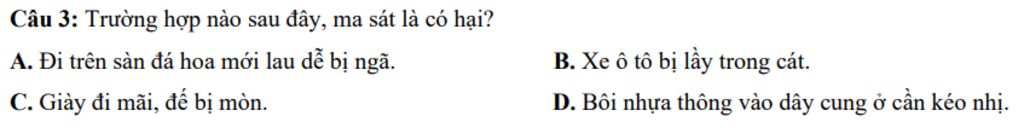 Câu 3: Trường hợp nào sau đây, ma sát là có hại?