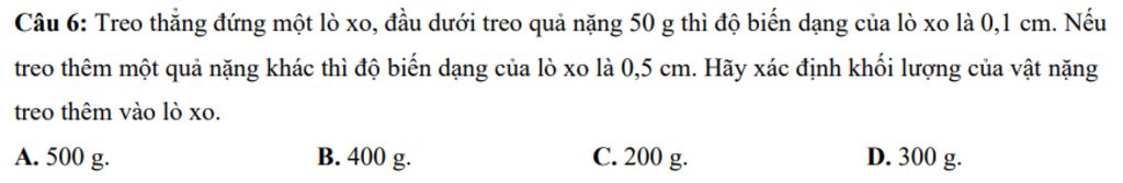 Câu 6: Treo thẳng đứng một lò xo, đầu dưới treo quả nặng 50 g thì độ biến dạng của lò xo là 0,1 cm. Nếu treo thêm một quả nặng khác thì độ biến dạng của lò xo là 0,5 cm. Hãy xác định khối lượng của vật nặng treo thêm vào lò xo.